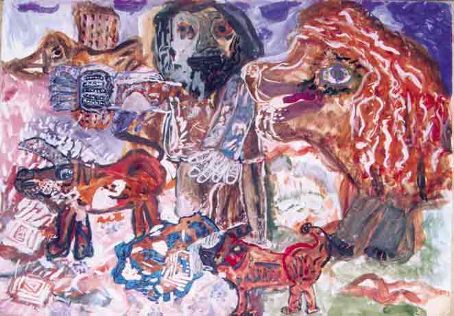 The artist combined several midrashes, which are different in situations, time and ideas: Adam, the friend of the animals endowing them with names is a colleague of God; Adam, receiving the clothes, kotnot or, is already an exile, apportioned and cast to an alien world. The clothes were graciously presented to the man expelled from Gan Eden.