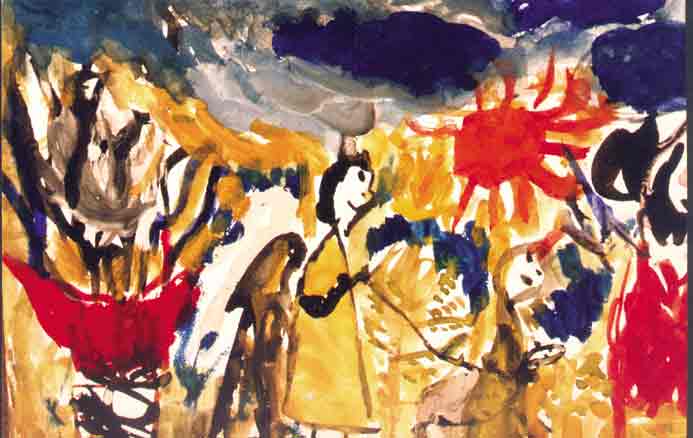 Let us “read” Stasik’s picture. The image, solved as sign and scheme, nevertheless is rich in associations and full of emotions. The child has managed to inscribe these associations into his sheet. One image flows into another one. The personages undergo deformations, which obey the logics of the artist’s compositional thinking. The color dominant of the picture is the red cup of the altar on the left, the flame in the right corner and the red-hot sun over the child’s figure. In the center of the composition one can see a rope, which ties together the figures of the father, the son, the donkey and the huge tree, surrounded by a piece of ultramarine sky which has broken through the steep slope. Akedath Itzhak is revealed by means of color built on the contrast between the blinding orange and yellow mountain landscape and the dark-blue sky.