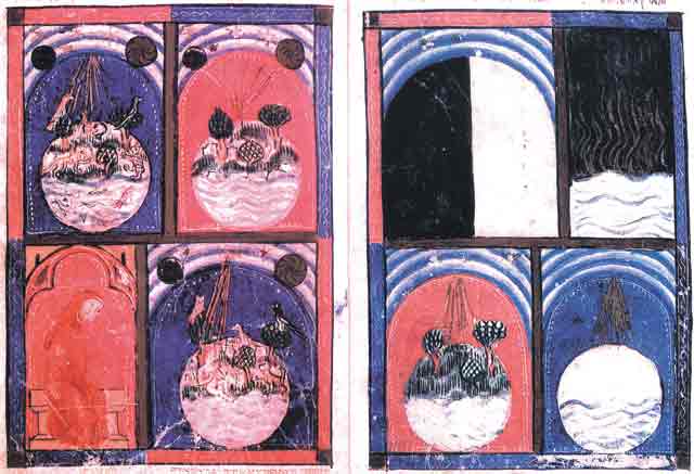And here again a child’s work contains astonishing calling-ups with works by masters of the past. “Sarajevo Haggadah” is an illuminated manuscript of the XIV century from Spain, called “Sarajevo” due to the place of its finding. In the illustration in question, the master created otot — signs, formulae of the stages of creation of the World. The first two fragments are for Day One. Over the abyss with storming waves, by vertical flashes of the dark flame, the darkness — khoshekh — is being lit up. It is the stage of tohu-va-vohu — the stage of extreme uncertainty.