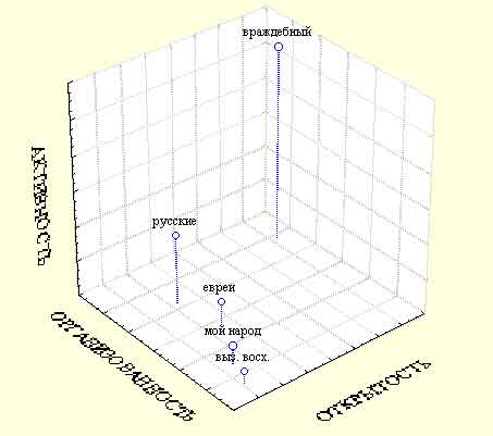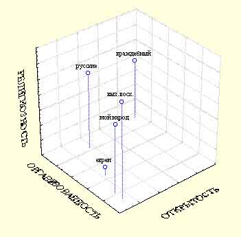 Посмотрим теперь на результаты второй серии нашего эксперимента. Напомню, что там подростков просили оценить характеристики уже не отдельных представителей, а народы в целом. При этом использовался ряд оценочных категорий: «мой народ», «народ, которым я восхищаюсь» и «враждебный мне народ». Подчеркнем, что здесь ни в коей мере не шла речь о конкретных народах, к которым подростки должны были обнаружить у себя враждебность или восхищение. Оценивались просто понятия, если хотите, словосочетания. При обработке суммарной матрицы результатов русских подростков было выделено три фактора, на основании которых классифицируются народы как объекты культурно-исторического процесса. Все факторы носят оценочный характер, то есть наиболее сильно дифференцировались по ним понятия «народ, которым я восхищаюсь» и «враждебный мне народ». Первый, однополюсной, фактор образовали такие характеристики, как «терпимый», «талантливый», «сильный», «миролюбивый», «свободолюбивый», «открытый», «религиозный», «трудолюбивый». Мы обозначили этот фактор как фактор открытости. Во второй фактор, на одном полюсе, вошли характеристики «сплоченный», «богатый», «организованный», «везучий», а на другом — «пьющий». Мы назвали этот фактор фактором организованности. Третий фактор образовали, с одной стороны, характеристики «активный», «умеющий приспосабливаться», а с другой — «покорный». Мы назвали этот фактор фактором активности. На рисунке 5 показано, как разместились в этом пространстве оцениваемые объекты. Здесь мы вновь сталкиваемся, уже на групповом уровне, с отрицательной самоидентификацией русских подростков. Интересно, что «мой народ» — здесь сугубо оценочное понятие, выражающее скорее какой-то непонятный, недостижимый идеал, чем представления о том реальном этносе, к которому принадлежат подростки.