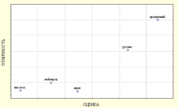 А вот категориальная структура сознания еврейских подростков в восприятии народов в целом оказалась проще, чем у их русских сверстников, — нами было выделено всего лишь два фактора. В первый фактор, с одной стороны, вошли характеристики «сплоченный», «богатый», «сильный», «миролюбивый», «организованный», «открытый», «везучий», «активный», «трудолюбивый», а с другой стороны — «покорный». Этот фактор наиболее сильно дифференцировал понятия «народ, которым я восхищаюсь» и «враждебный мне народ». Поэтому мы назвали его оценочным фактором. Положительный полюс второго фактора составили свойства «терпимый», «религиозный», «талантливый», «свободолюбивый», «умеющий приспосабливаться», а отрицательный — «пьющий». Наиболее сильно оказались противопоставленными по этому фактору понятия «еврейский» и «враждебный мне народ», поэтому мы назвали этот фактор фактором этничности. Видимо, проблема алкоголизма очень остра в нашем современном обществе, если подростки обеих групп отвели этому свойству такое важное, «факторообразующее», место в своих этнических картинах мира. Расположение объектов внутри сконструированного в данном случае пространства представлено на рисунке 6. Можно отметить, что по фактору этничности понятие «народ, которым я восхищаюсь» очень близок с «еврейским народом». Однако по фактору оценки разрыв существует: видимо, еврейские подростки готовы восхищаться народом, который, по их представлениям, менее покорен, чем еврейский народ. Оценочность понятия «мой народ» здесь также прослеживается, хотя и не в такой степени, как мы видели это у русских подростков. Однако здесь приходится обратить внимание на очень тревожную, с нашей точки зрения, тенденцию, в некоторой степени проявившуюся еще в первой серии эксперимента: понятие «русский народ» по обеим шкалам достаточно сильно сдвинуто в сторону понятия «враждебный мне народ». Подчеркнем, что эта тенденция является односторонней — подобное явление не выявлено на выборке русских испытуемых. Мы сознательно стараемся избегать здесь любых советов и рекомендаций, но, по крайней мере, хотя бы осмыслить этот феномен, с нашей точки зрения, необходимо.