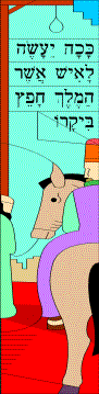 сцене Ахашверош и Аман работают над бумагами. У сцены Мордехай наставляет