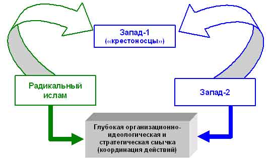 Если дрейф в политический Постмодерн (глобализация) действительно имеет место, то чем он чреват? Дальнейшей смычкой части Запада с радикальным исламом. А что означает эта смычка? Что удары по "крестоносному" фокусу будут наноситься в другой логике и с помощью других технологий. Что это будет другой тип войны с другими последствиями. "Крестоносный" Запад (Запад-1) окажется взят в тиски. Такая модель (рис. 5) еще не означает, что война безусловно проиграна. Весь вопрос в том – с кем бороться. Правильный ответ на этот вопрос определит эффективность применяемых средств борьбы.